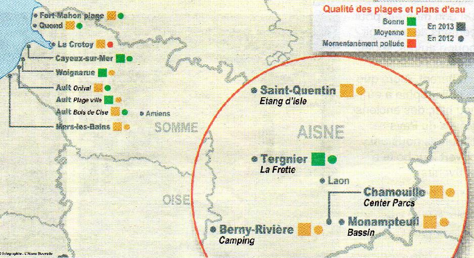AISNE - Les résultats sont tombés : les baigneurs pourront venir en Picardie cet été. Les 17 sites de baignade de la région sont classés en catégorie A ou B. Une baignade sans risque pour la santé: (extrait de l'Aisne Nouvelle du mardi 18/6/2013).