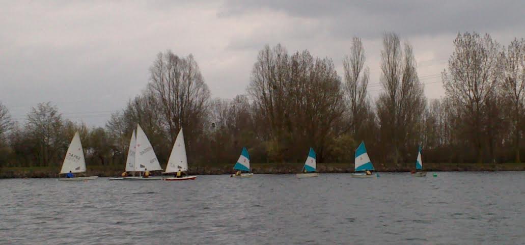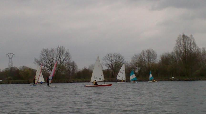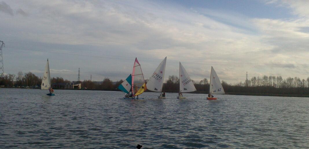 dizaine de bateaux sur l'eau, 3 optimists et 6 lasers dont un de Soissons